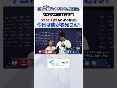 This interview took place after the exhibition performance where Kihara zipped up Miura’s dress. Kihara says: 今日は僕がお兄ちゃんでした (Kyō wa boku ga oniichan deshita, Today I was the big brother), in contrast to the day before, when Miura called herself お姉ちゃん (oneechan, big sister). In response, Miura gently slaps Kihara on the arm and says なんやねん (nanyanen, What’s this nonsense?), a Kansai dialect phrase often used in comedy. Miura here plays the ツッコミ (tsukkomi, straight man [person]) to Kihara's ボケ (boke, funny man), and the arm slap/touch is a common feature of this role.